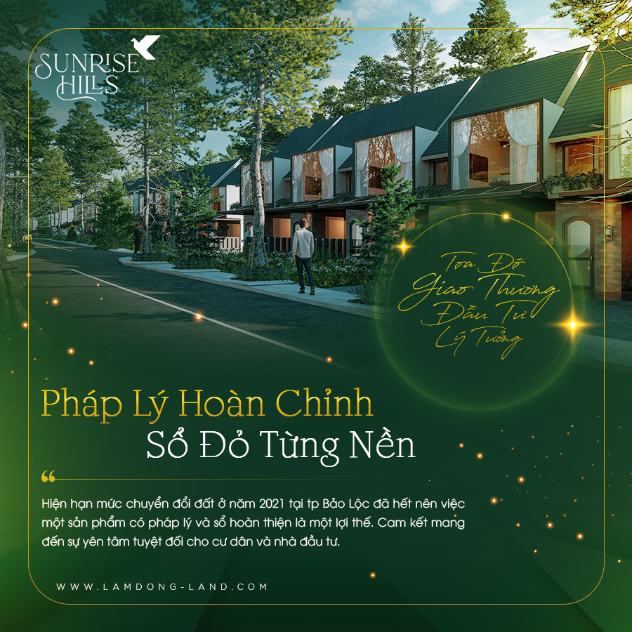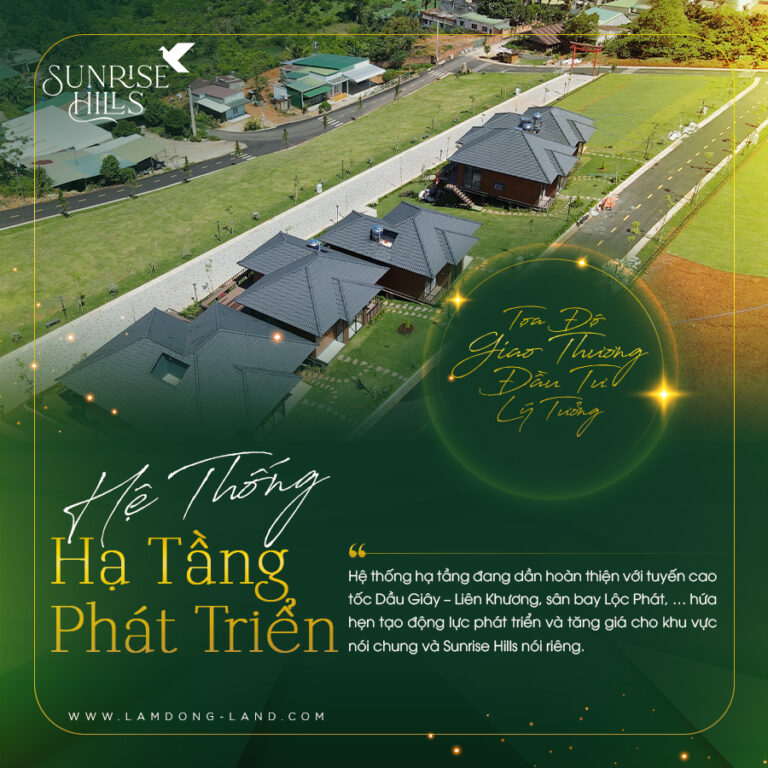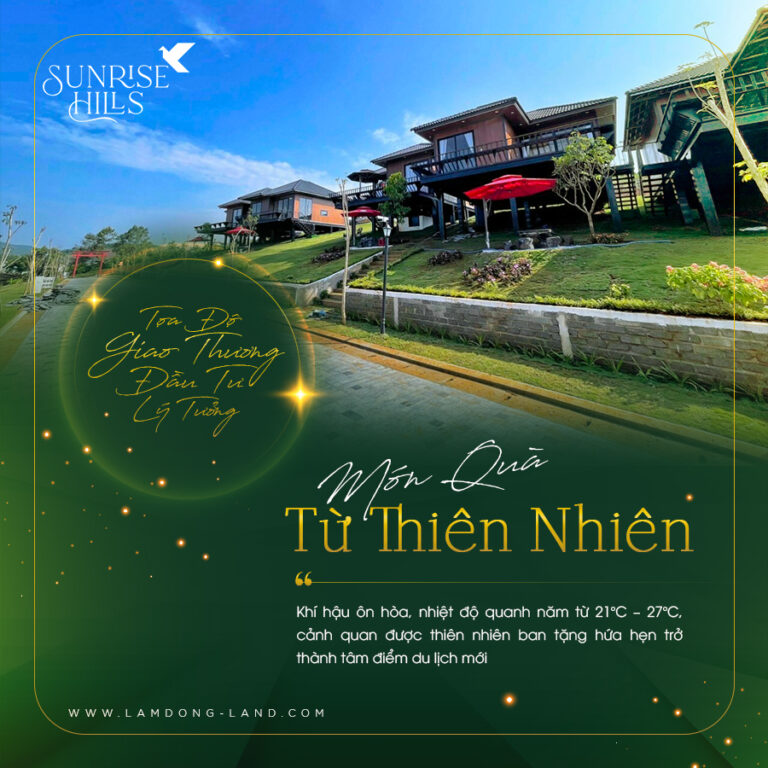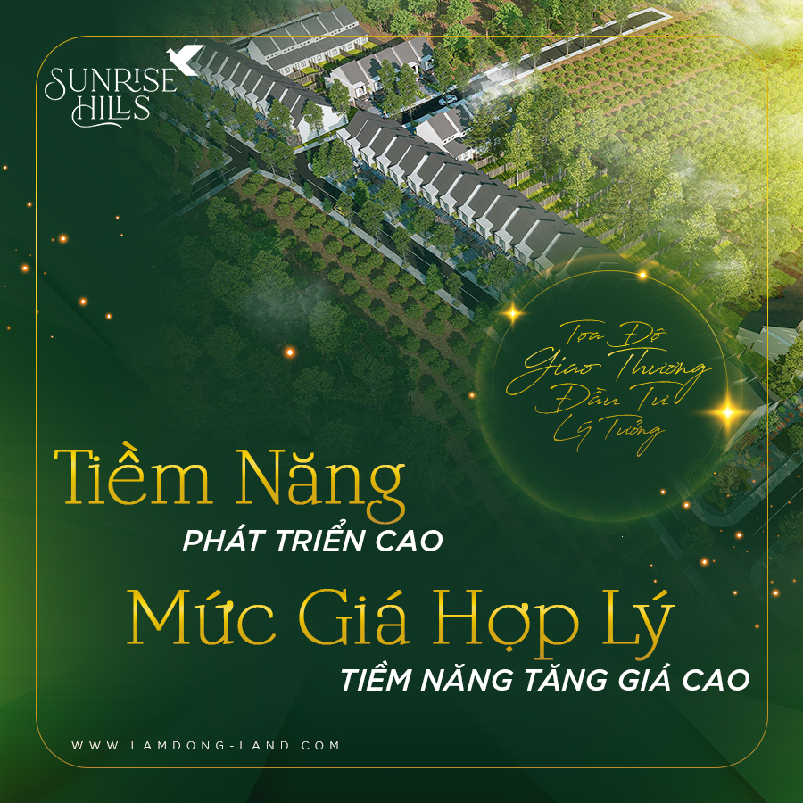 Sunrise Hills hứa hẹn sẽ là chốn an cư và đầu tư lý tưởng dành cho khách hàng. Đây là dự án đầu tiên trong khu vực với vị trí đắc địa nằm trên sườn đồi cao, ôm trọn hướng nhìn ra cao nguyên xanh mát, khách hàng sẽ được đón ánh bình minh trong bầu không khí trong lành và tươi mát mỗi ngày. Bên cạnh đó, Sunrise Hills còn được bao bọc bởi nhiều tuyến được huyết mạch tại Lâm Đồng và chỉ cách Quốc Lộ 20 chỉ 3 phút di chuyển.